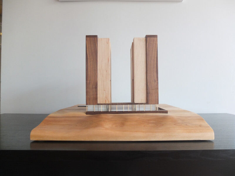 Bien que légèrement distinctes, les deux tours se déploie en symétrie de sorte à être perçue de façon unitaire dans leur contexte élargi, comme résultant d’un même geste volumétrique. Cette sensibilité au contexte d’insertion vise à simplifier la lecture globale du projet afin de mettre en valeur le patrimoine bâti et paysager du site.