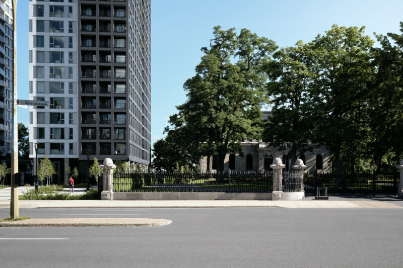 Puisant dans les principes d’organisation spatiale régissant les grands domaines du secteur, le projet s’implante en retrait des rues, dégageant de larges espaces verts le long du boulevard René-Lévesque.